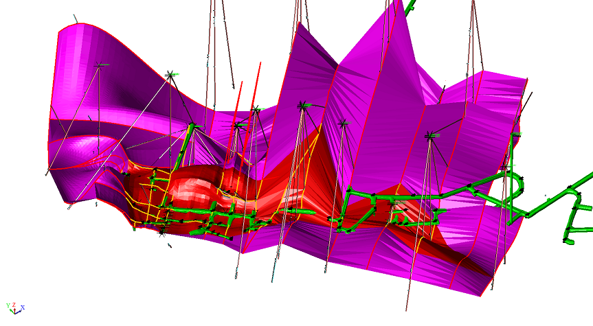 依據(jù)地質(zhì)編錄三維化結(jié)果對剖面邊界開展二次圈定工作,實現(xiàn)三維化邊界控制,較傳統(tǒng)方法更精準,真實反映礦體空間位置、形態(tài)。