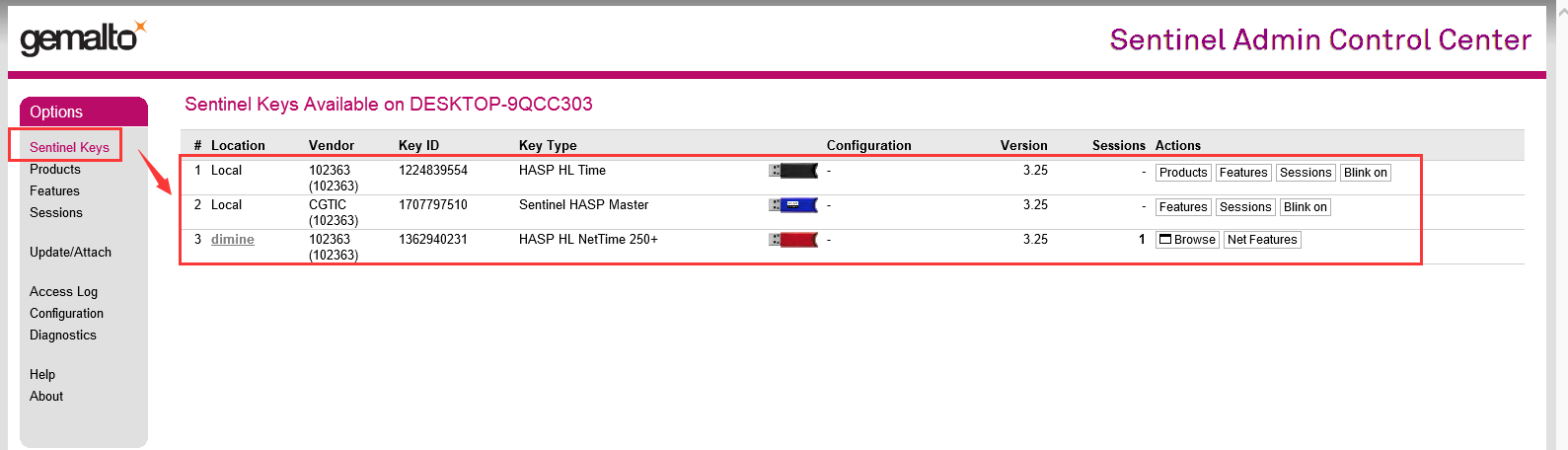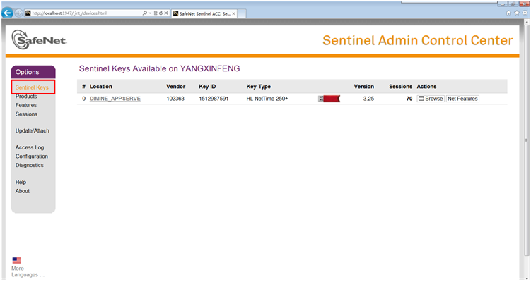 (4)完成上述設置后,在Sentinel Keys項中可查看硬件加密鎖連接信息,如下圖所示: