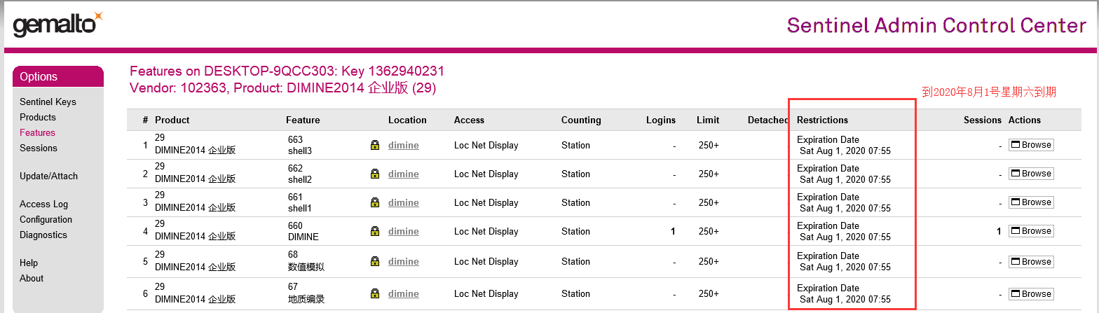 4、點擊相應產品后面的features,查看對應加密鎖有效期